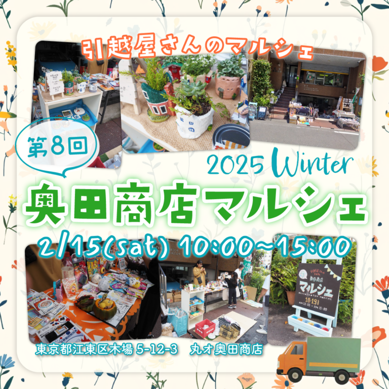「奥田商店マルシェ」は「ハトのマークの引越専門江東センター 丸オ奥田商店」が開催する地域密着型マルシェのこと。丸オ奥田商店は地域に愛され続けて約70年の、歴史ある引越屋さん。そんな丸オ奥田商店の現社長は跡取り娘の女社長!女性らしい柔軟性と包容力が、街への愛に溢れています。